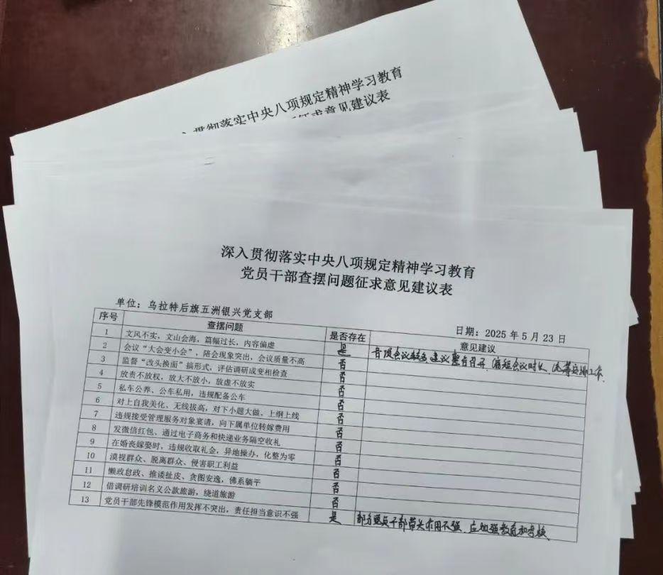 會(huì)上,大家對(duì)標(biāo)習(xí)近平總書記關(guān)于加強(qiáng)黨的作風(fēng)建設(shè)的重要論述和重要指示批示精神,對(duì)照《中央八項(xiàng)規(guī)定及其實(shí)施細(xì)則精神》,結(jié)合各自工作實(shí)際,堅(jiān)持實(shí)事求是和問(wèn)題導(dǎo)向原則,從思想引領(lǐng)、遵規(guī)守紀(jì)、作風(fēng)建設(shè)、以學(xué)促干以及工作成效等方面做了全面查擺和自查自糾。同時(shí)緊扣中央八項(xiàng)規(guī)定內(nèi)容,從文風(fēng)會(huì)風(fēng)、推諉扯皮、擔(dān)當(dāng)作為、公款旅游、隔空送禮等方面編制、印發(fā)了《黨員干部查擺問(wèn)題征求意見表》,認(rèn)真聽取黨員群眾的意見和建議。