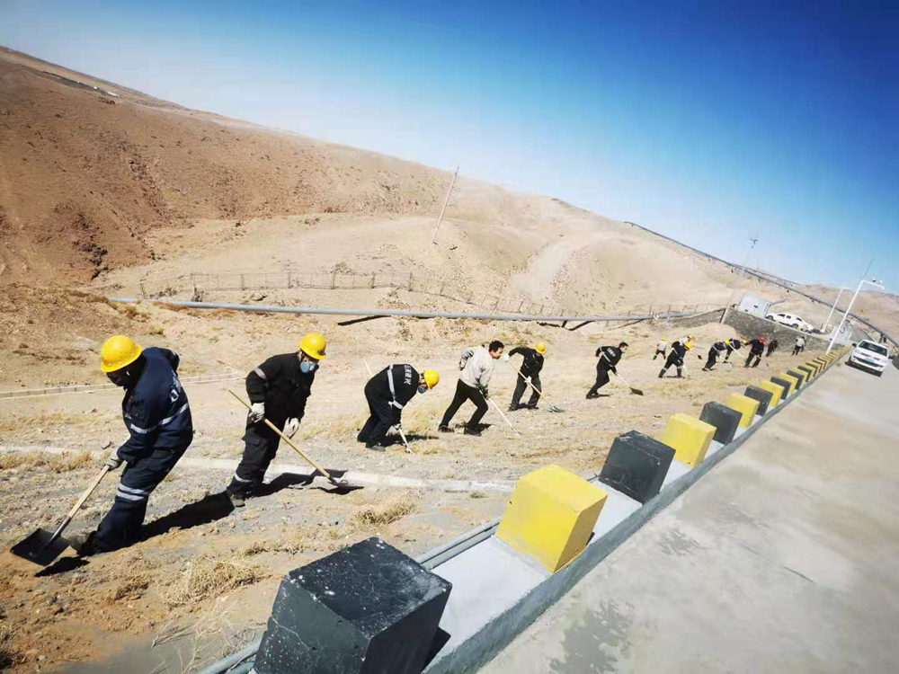 本次活動(dòng)重點(diǎn)對(duì)基礎(chǔ)壩兩側(cè)坡面進(jìn)行綜合治理,治理長(zhǎng)度約1.5公里。面對(duì)坡陡、風(fēng)大、黃沙亂舞的工作環(huán)境,黨員干部不懼困難、以身作則、俯沖一線,帶頭撿拾垃圾、清理尾砂、覆土灑水以及對(duì)安全警示牌進(jìn)行維護(hù)保養(yǎng)。廣大職工緊跟其后,或一字排開(kāi),或矩陣展開(kāi),忙碌的身影遍布整個(gè)坡面,鏟車(chē)的轟鳴聲、鐵锨的吱吱聲與狂風(fēng)的呼嘯聲琴簫合奏,在藍(lán)天、斜陽(yáng)和荒山的襯托下,勾勒出一幅“聲與色”、“動(dòng)與靜”相得益彰的勞動(dòng)生產(chǎn)畫(huà)卷。