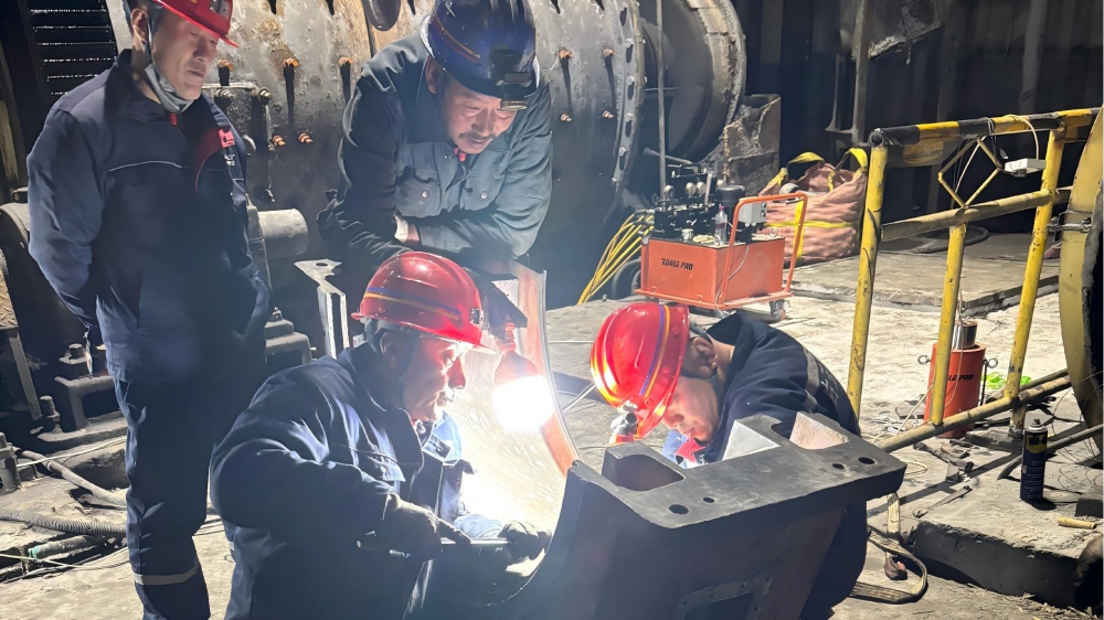 故障發(fā)生后,白玉銀興公司經(jīng)理田東清迅速抵達(dá)現(xiàn)場(chǎng),根據(jù)設(shè)備故障狀況進(jìn)行現(xiàn)場(chǎng)研判并采取果斷措施進(jìn)行停機(jī)搶修。在搶修現(xiàn)場(chǎng),黨員干部主動(dòng)亮身份、扛重?fù)?dān),充分發(fā)揮先鋒模范作用,成為搶修隊(duì)伍中的“主心骨”。田東清帶領(lǐng)維修團(tuán)隊(duì)趴在設(shè)備旁仔細(xì)排查故障點(diǎn),在刮瓦環(huán)節(jié)精細(xì)操刀,憑借多年豐富經(jīng)驗(yàn)和專(zhuān)業(yè)技術(shù)儲(chǔ)備,勾畫(huà)出完美的弧線。為了加快搶修進(jìn)度,搶修人員放棄休息時(shí)間,輪班作戰(zhàn)、每天連續(xù)工作16小時(shí),累了就趴在桌上短暫小憩,始終堅(jiān)守在搶修一線。食堂將飯菜、飲用水送到現(xiàn)場(chǎng),確保搶修人員有充沛的體力。